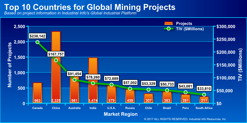 These projects include active projects in all stages of activity from the early exploration stage to planning, engineering and under construction. Canada, China, Australia and India are the top four countries in the world for mining project development.