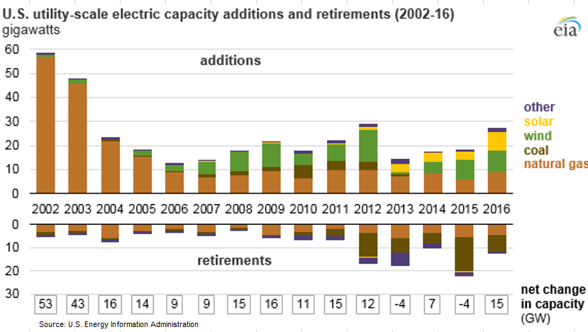 Click on the image at right to see a snapshot of U.S. utility-scale power generation additions and retirements from 2002 through 2016.