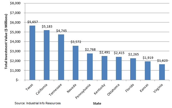Texas, California and Tennessee were the states that added the most new generation on a total investment value (TIV) basis last year, according to Industrial Info's North American Project Platform. Tennessee leapt into the top three by virtue of the Tennessee Valley Authority's completion of the Watts Bar Unit 2 nuclear unit. In Texas, new windfarms accounted for about $4.5 billion of the $5.7 billion of new power plants that came online there last year. In California, new utility-scale solar power projects valued at about $4.4 billion accounted for most of the $5.2 billion of new utility-scale power projects that began operating in 2016.