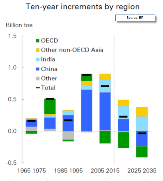 Looking at demand growth for coal in different global regions, BP shows how strong demand growth by China over the prior 20 years supported global coal demand growth during that time. But with dramatic declines forecast in China's demand through 2035, coal faces a difficult future around the world, BP said.