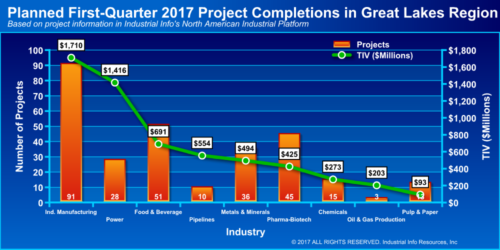 Researched by Industrial Info Resources (Sugar Land, Texas)--Industrial Info is tracking $5.86 billion in planned project completions in the U.S. Great Lakes region in the first quarter of this year. The Industrial Manufacturing Industry leads in the value of planned completions, with $1.71 billion, followed by the Power Industry, with $1.42 billion. This is followed in a distant third by the Food & Beverage Industry, with $691 million in planned completions.