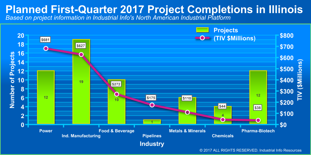 Researched by Industrial Info Resources (Sugar Land, Texas)--Illinois, with more than $1.9 billion in planned first-quarter 2017 project completions, leads the Great Lakes region for the value of projects set to be completed during the first three months of this year. As with other states, the Power Industry, with $681 million in planned project completions, leads the way in terms of value. This is followed by the Industrial Manufacturing Industry with $627 million in planned first-quarter completions, and the Food & Beverage Industry, with $272 million in planned completions.