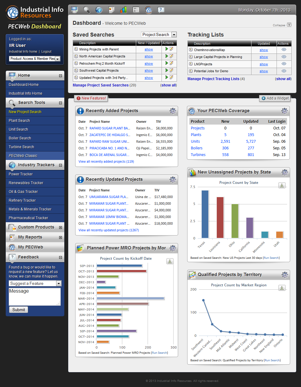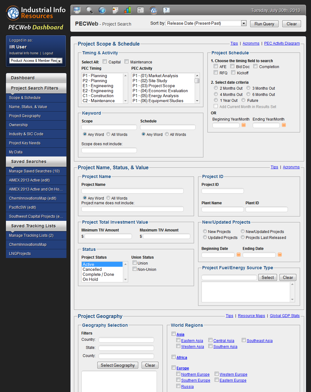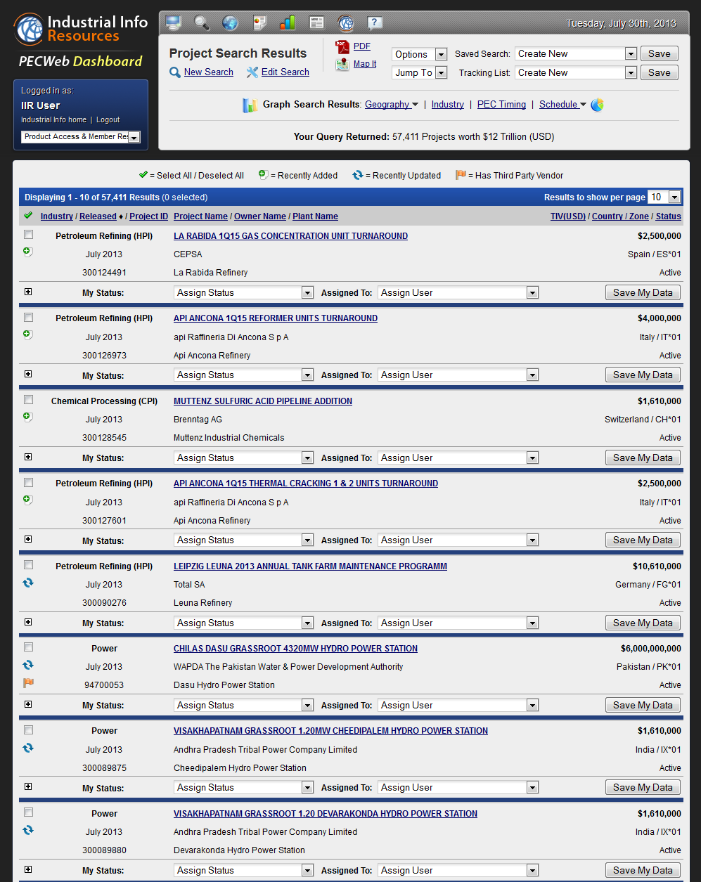 Industrial Info Resources (Sugar Land, Texas) is pleased to announce the release of the new PECWeb Dashboard, adding increased flexibility, customization and speedier searches in our Industrial Project & Plant Database, which contains detailed information on more than 57,000 active projects across the world with a combined value of more than $12 trillion, and 96,500 operational and pre-commissioned industrial facilities.