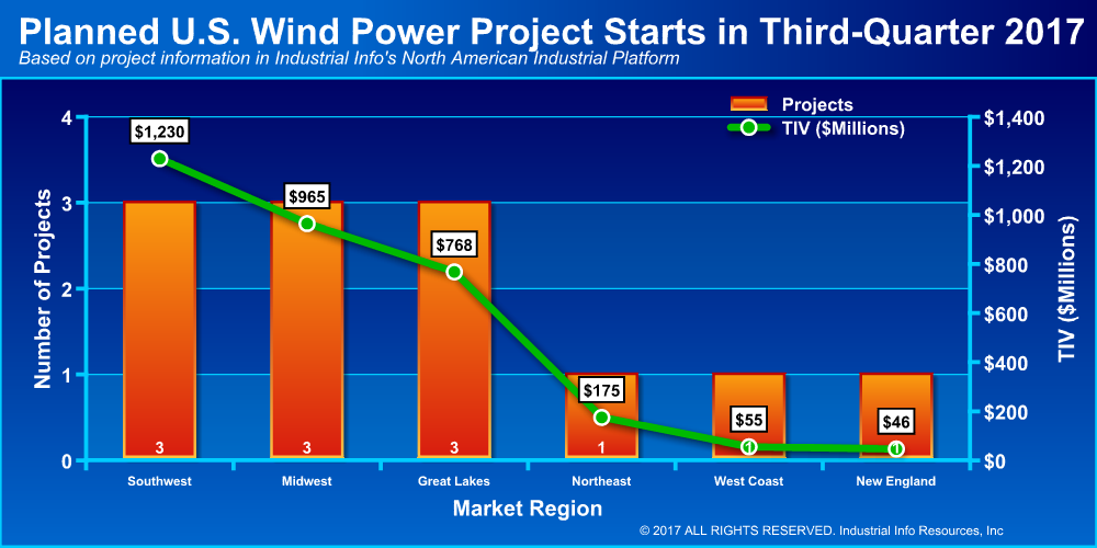 Researched by Industrial Info Resources (Sugar Land, Texas)--Industrial Info is tracking $3.24 billion in U.S. wind power projects that are planned to kick off in the third quarter of 2017. Wind energy producers are eager to kick off construction on projects this year in order to receive 80% of the 2.3-cents-per-kilowatt-hour production tax credit before it steps down 60% for projects started in 2018. The Southwest region, with $1.23 billion in planned third-quarter wind project starts, leads the country in terms of value, followed by the Midwest region, with $965 million in planned starts.