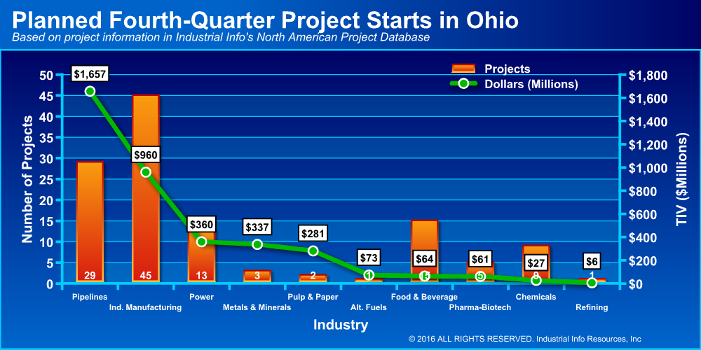 Researched by Industrial Info Resources (Sugar Land, Texas)--Industrial Info is tracking $3.83 billion in projects in Ohio that are scheduled to kick off from October through December of this year. The Oil & Gas Pipelines Industry, with 29 projects valued at $1.66 billion, leads the state in investment value, followed by the Industrial Manufacturing Industry, with $960 million in planned fourth-quarter project starts.