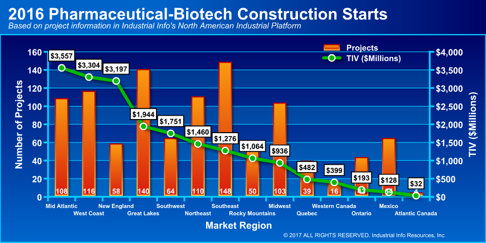 Click on the image at right for a breakdown by market region of 2016 Pharmaceutical-Biotech construction starts in 2016.Despite redundancy resulting from the industry's ongoing merger and acquisition activity, as well as economic fluctuations across the globe, 1,063 projects representing an average total investment value (TIV) of $18.5 million managed to make it to construction status.