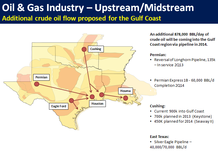 As production has escalated rapidly in these and other areas, midstream development companies are scrambling to put in place the necessary infrastructure to get this oil and gas to refineries and processing plants. Companies are investing billions of dollars into projects to move crude oil to the Gulf Coast, either directly or via the oil hub in Cushing, Oklahoma, where increased outgoing capacity has cleared much of the crude oil bottleneck seen over the past few years, easing crude oil transport to the Gulf.