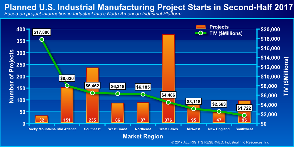 Click on image at right for a breakdown by market region of planned second-half 2017 Industrial Manufacturing Industry project starts in the U.S.